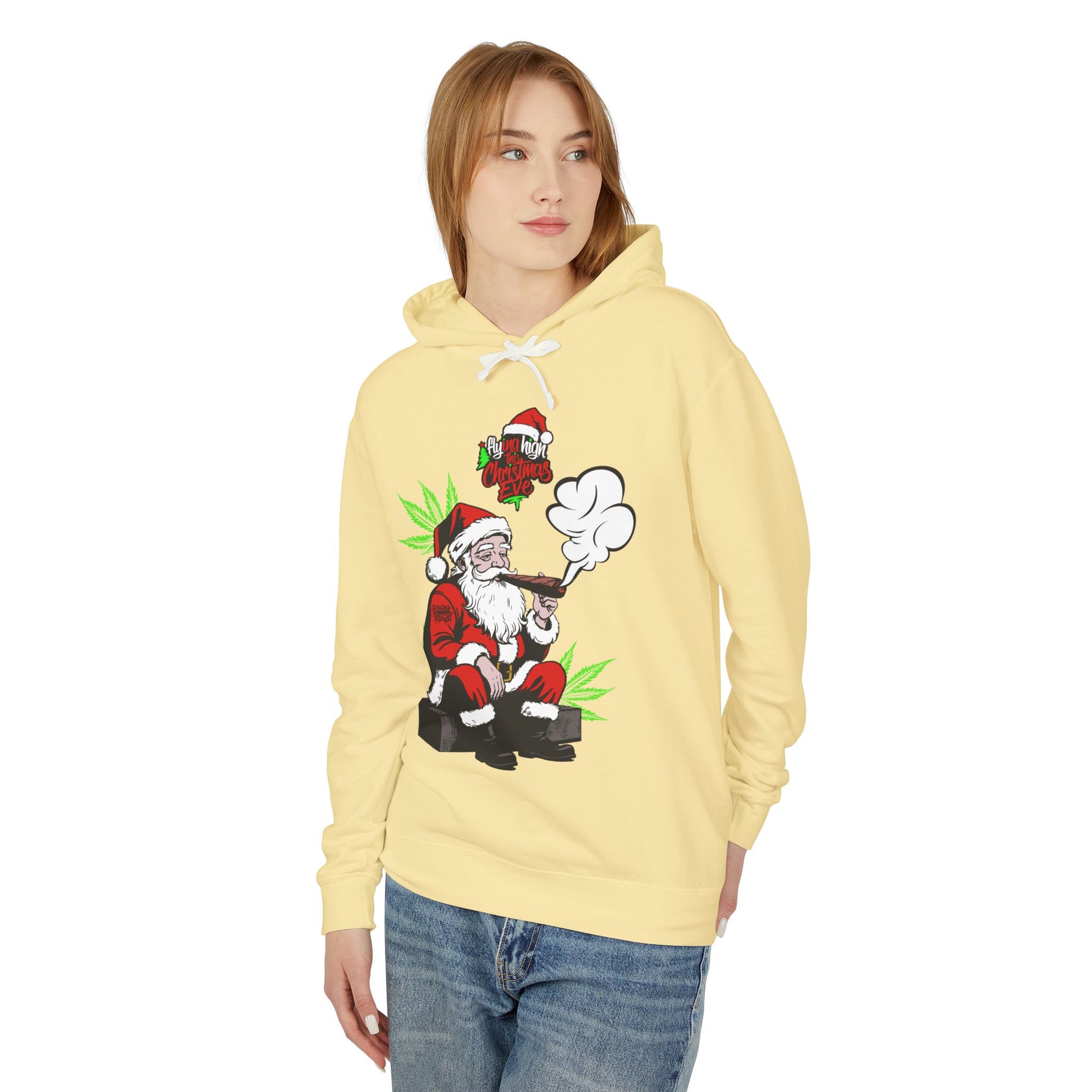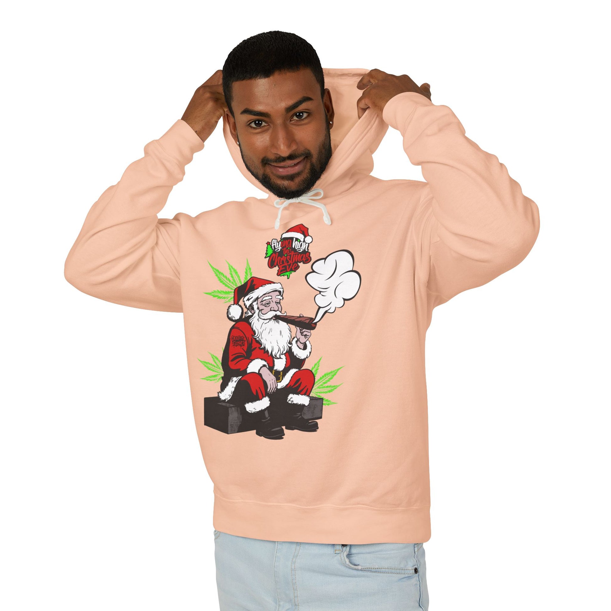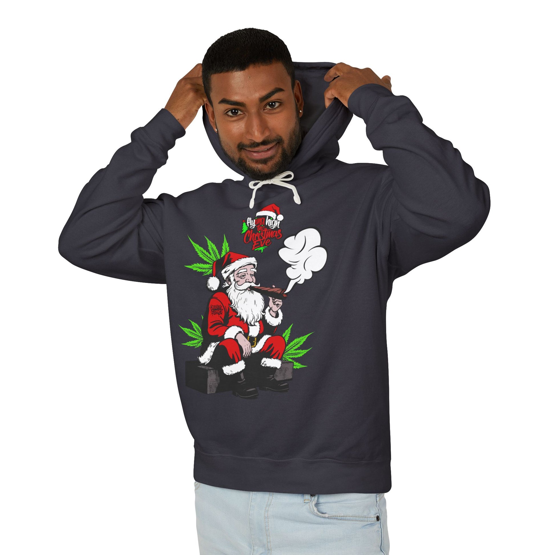 A relaxed, lightweight hooded sweatshirt that brings a playful, laid-back twist to holiday style. The front shows a chill Santa taking a long puff, framed by glossy green leaves that hint at a mischievous holiday mood. The back bursts with bold, hand-lettered type wrapped in a Santa hat and leafy accents reading “Flying high on Christmas Eve” — bright reds and greens pop against a warm natural base. Wear it when you want to lean into funny, cozy vibes during winter gatherings, late-night car rides, or low-key holiday parties. The soft, breathable cotton and relaxed cut make it easy to layer over tees and flannels, while the jersey-lined hood and flatcord add small, thoughtful details. It’s a sweatshirt that reads like a wink — familiar holiday imagery remixed with counterculture humor, built for people who celebrate the season with a sense of humor and relaxed comfort.