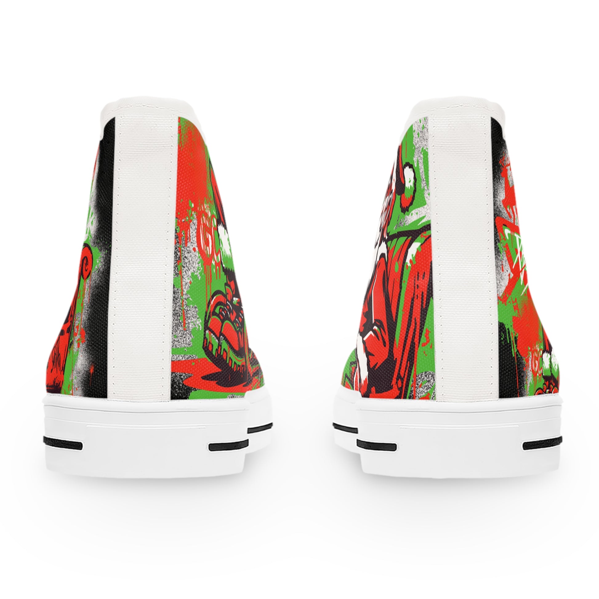 These high-top sneakers bring playful, streetwise energy to every step. The wraparound print mixes bold reds and greens with a hand-drawn Santa motif, giving the shoes a rebellious holiday vibe that reads like a sketchbook crossed with pop art. Cushioned EVA memory-foam insoles and a foamed polyester lining keep feet cushioned through long days of roaming markets, hopping on transit, or lingering at a winter pop-up. Black pleather toe caps and silver metal eyelets add contrast and durability, while the durable rubber outsole handles wet sidewalks and cobbled streets. Wear them with cropped jeans, a long coat, or a cozy sweater to let the graphic sing — these sneakers carry a festive attitude without feeling seasonal-only.