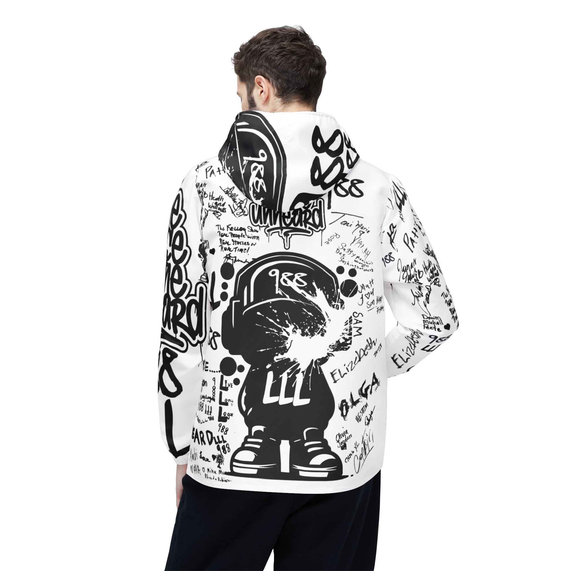 This windbreaker is a quiet, wearable memorial — names handwritten in black marker across a white field, each one a raw, personal testament gathered during a trip to Arizona about suicide prevention. The jacket reads like a page of remembrance: bold strokes, uneven handwriting, and an unapologetic presence that gives voice to lives and stories most often kept private. Lightweight and breathable, it moves with you through skate sessions, late-night walks, or rainy city corners, offering a calm layer that resists wind and drizzle while keeping the message visible and close. The close-fitting silhouette and elastic cuffs hold the artwork near the body; if you like room to layer, choose the next size up. Wear it when you want to carry memory, solidarity, and quiet rebellion in every step.