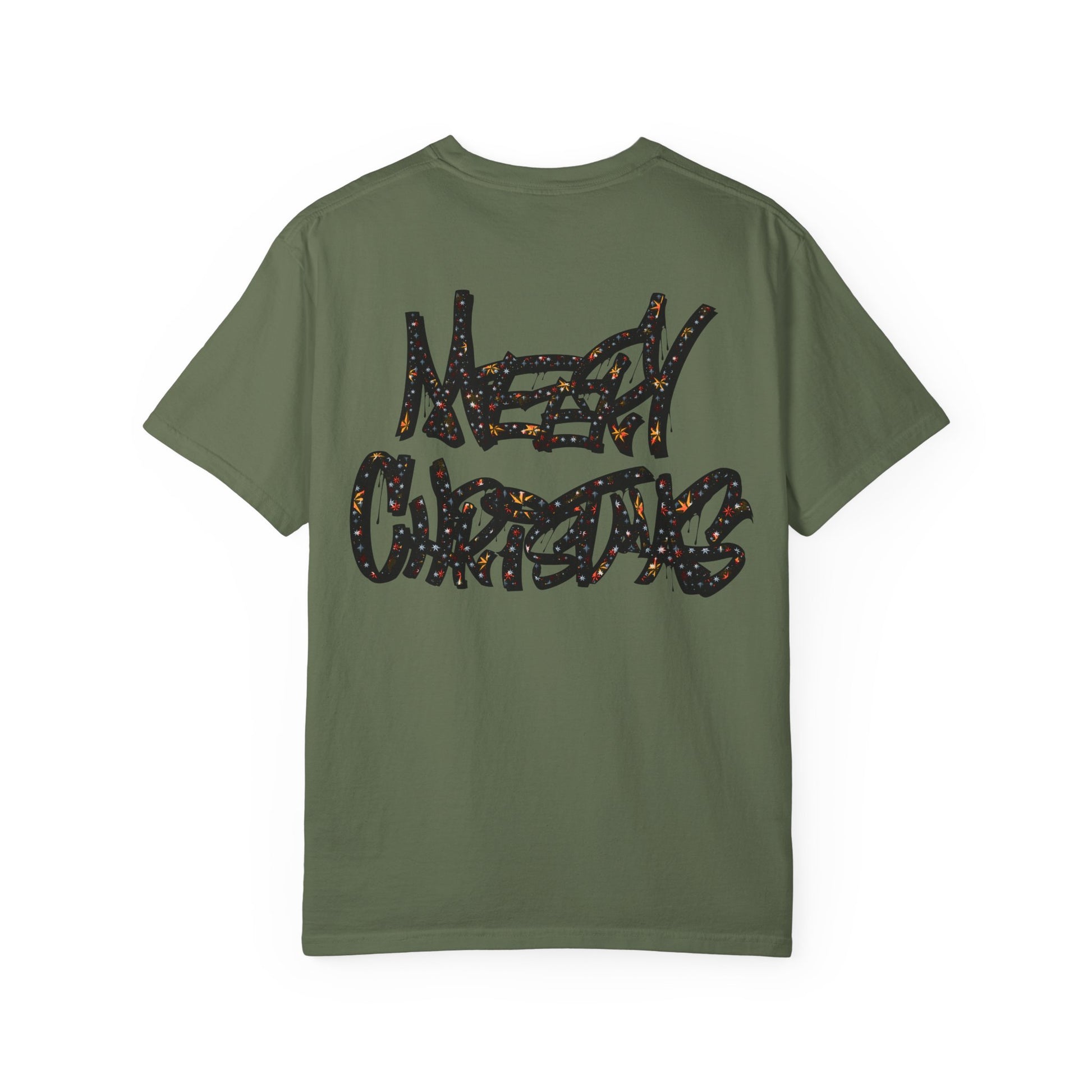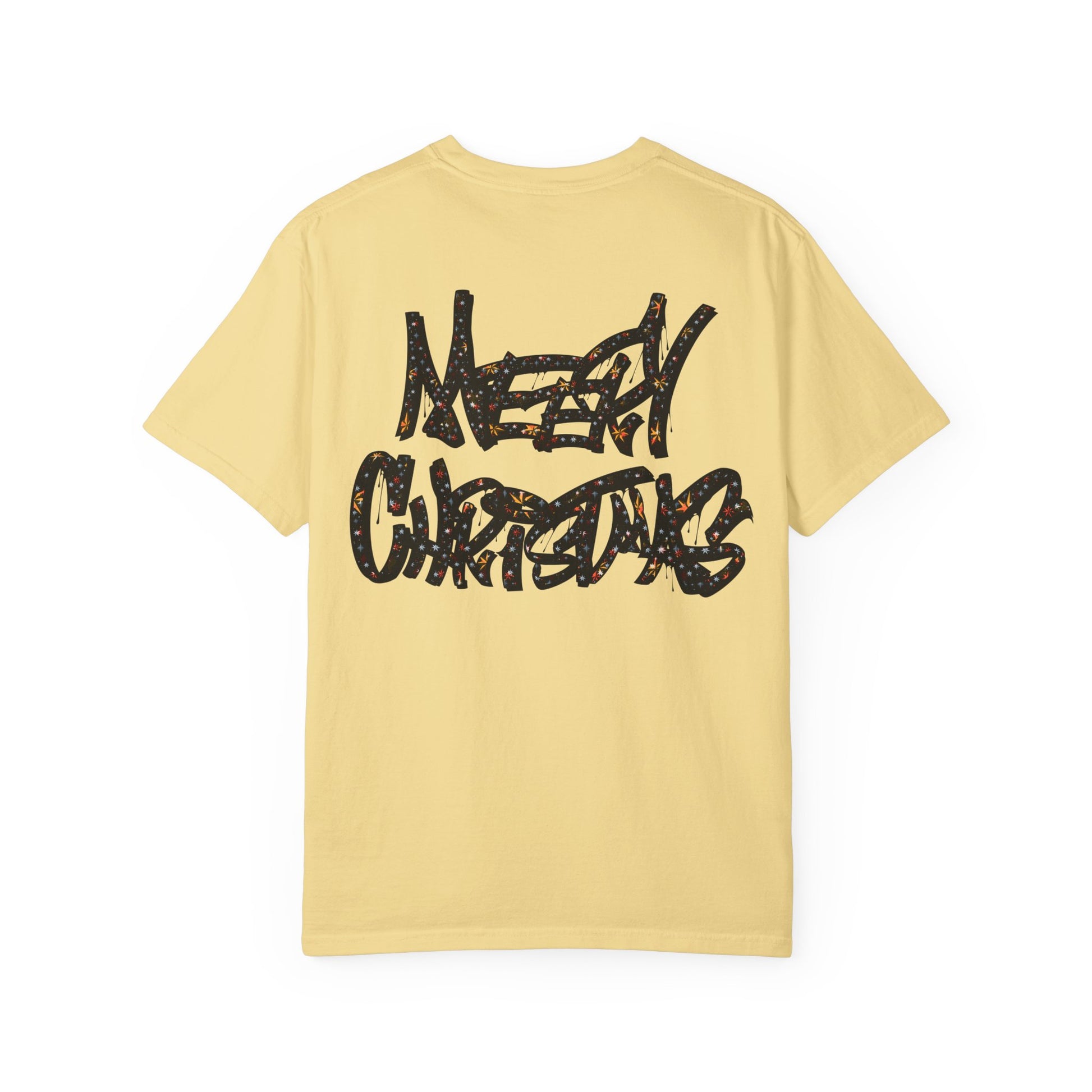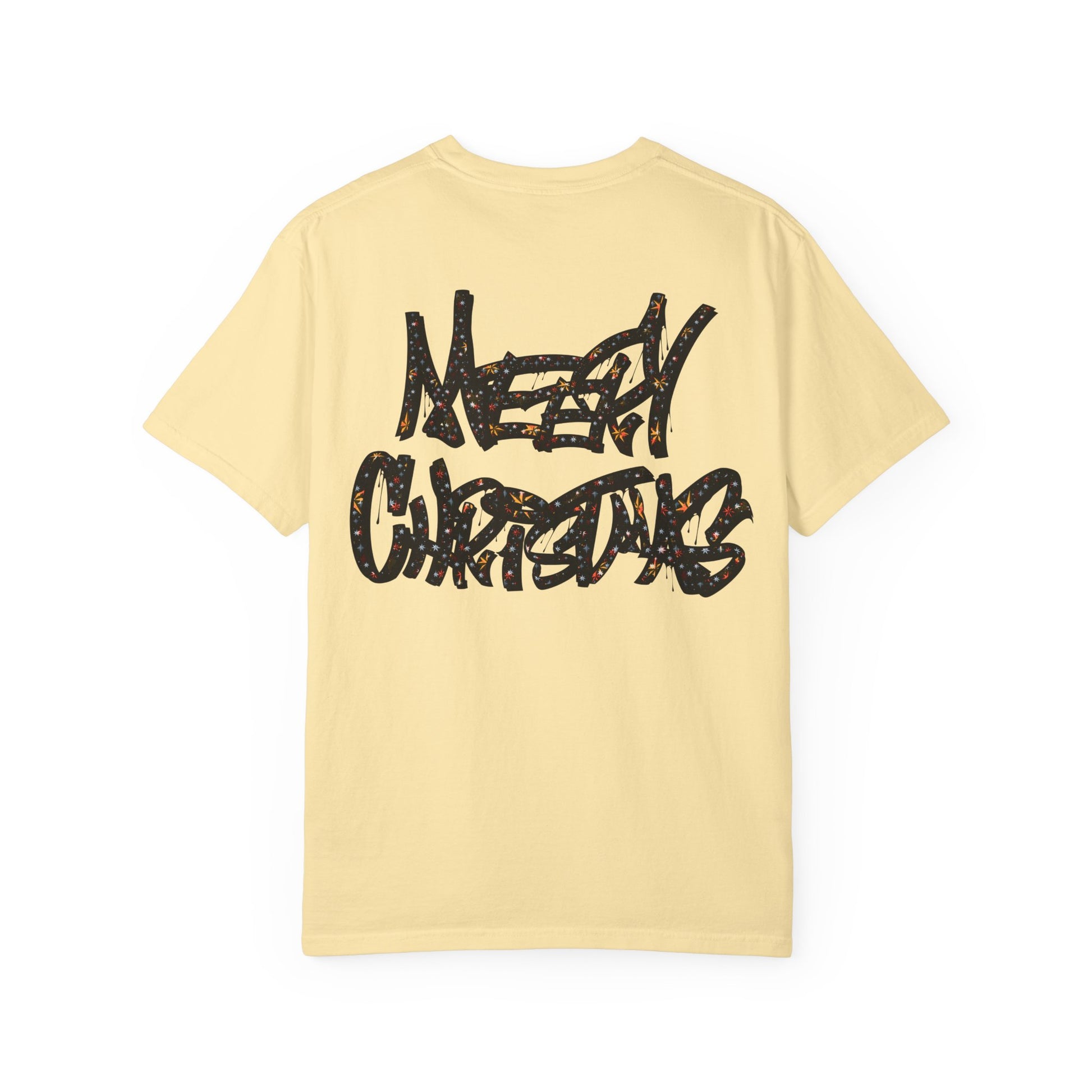 This relaxed, garment-dyed tee brings a playful, irreverent cheer to cold-weather gatherings. The bold, all-caps slogan declares a loud, cheeky holiday spirit — not sweet, not subtle — just pure, in-your-face merry. It drapes softly over shoulders and hangs with an easy, lived-in look that makes it a go-to for casual nights by the tree, rowdy family dinners, or cheeky photos for the season. Wear it with worn denim, a chunky knit overtop, or layered under a flannel; it reads like the outfit of someone who loves holiday chaos and laughs about it later. The muted, softened color and relaxed fit keep the vibe comfortable and approachable, while the graphic does the talking. For someone who celebrates with humor and honesty, this tee lands squarely in the middle of cozy and confrontational — exactly the mood of those loud, bright winter nights.