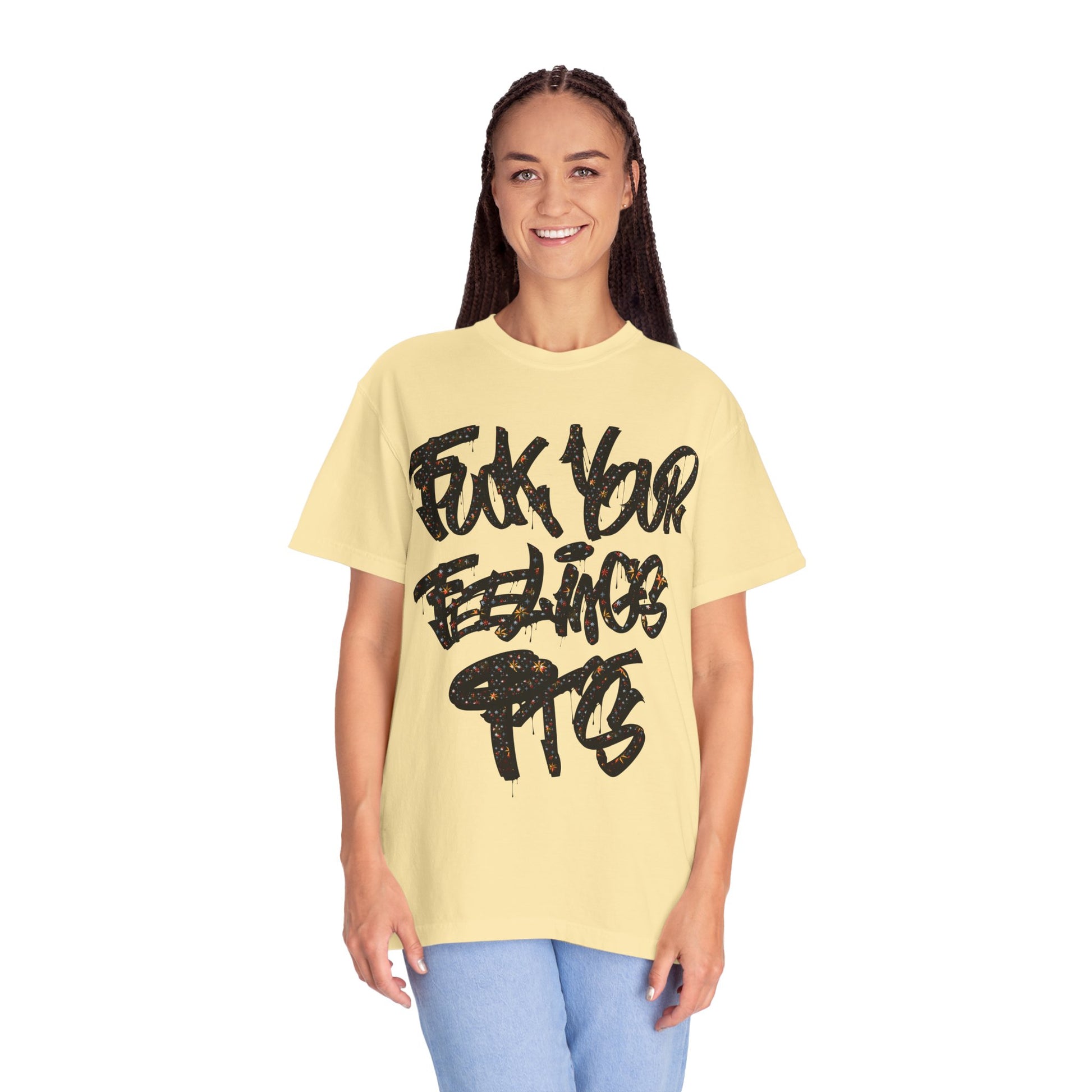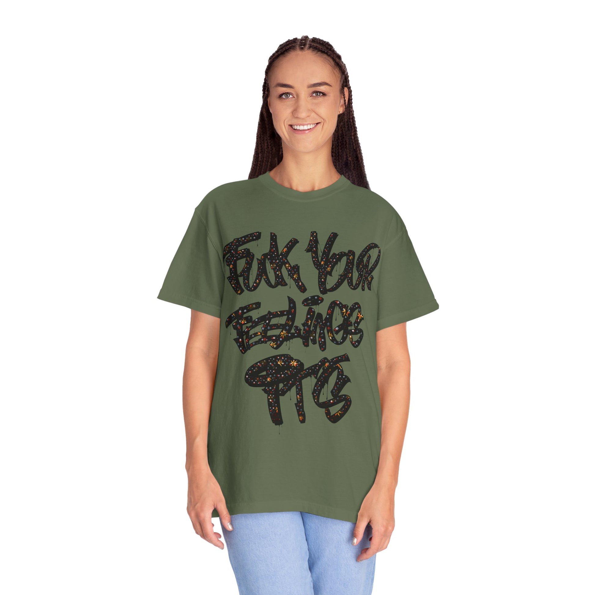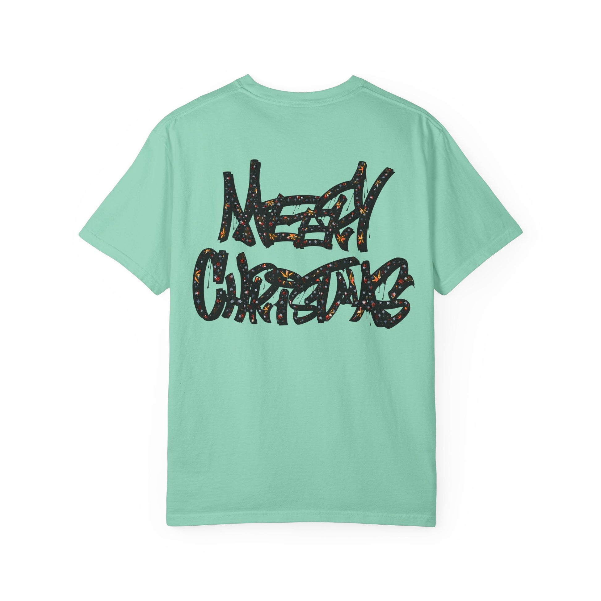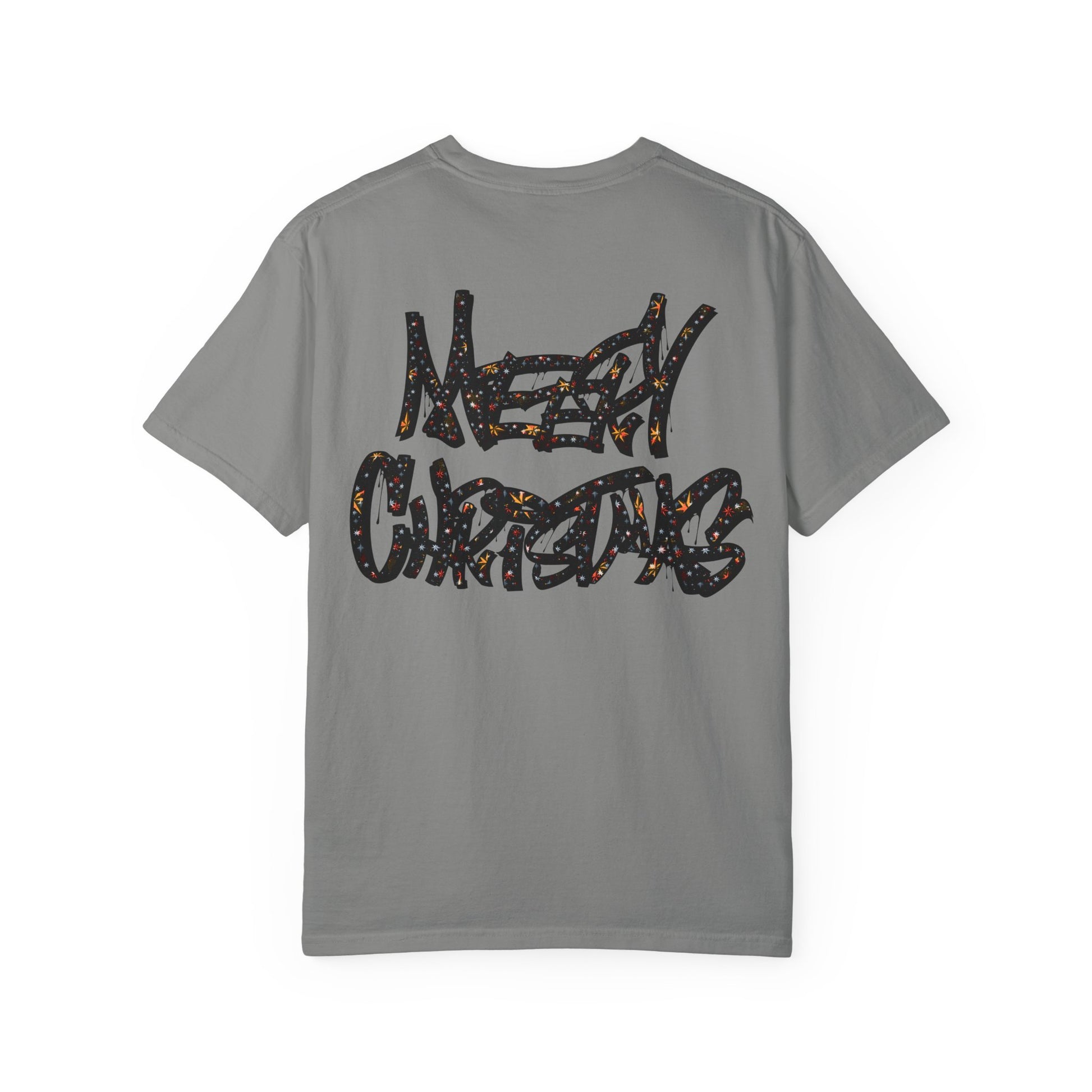 This relaxed, garment-dyed tee brings a playful, irreverent cheer to cold-weather gatherings. The bold, all-caps slogan declares a loud, cheeky holiday spirit — not sweet, not subtle — just pure, in-your-face merry. It drapes softly over shoulders and hangs with an easy, lived-in look that makes it a go-to for casual nights by the tree, rowdy family dinners, or cheeky photos for the season. Wear it with worn denim, a chunky knit overtop, or layered under a flannel; it reads like the outfit of someone who loves holiday chaos and laughs about it later. The muted, softened color and relaxed fit keep the vibe comfortable and approachable, while the graphic does the talking. For someone who celebrates with humor and honesty, this tee lands squarely in the middle of cozy and confrontational — exactly the mood of those loud, bright winter nights.